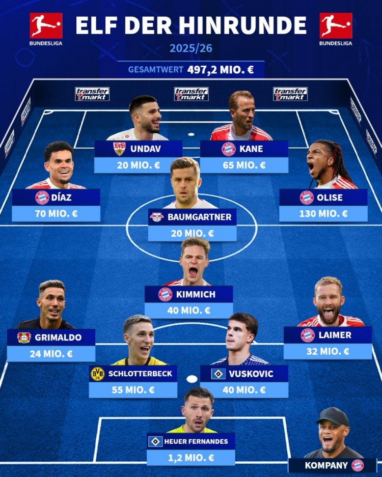 1月17日讯 德甲已经结束了上半程的争夺,德国转会市场评选出了半程最佳阵容,凯恩、基米希领衔拜仁5将入选,格里马尔多在列。